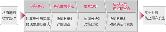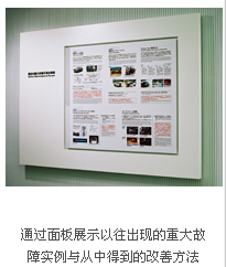 在上述展示區(qū)的鄰近地方還設置了對實際市場質(zhì)量實施調(diào)查與進行改善活動的區(qū)域。相關的具體業(yè)務內(nèi)容通過流程圖可一覽無遺。從顧客及銷售公司回收出現(xiàn)問題的零部件并開展調(diào)查,制定最終方案的流程一目了然。